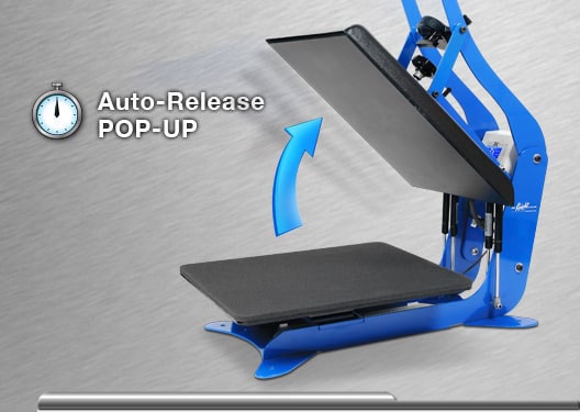 The Auto-Release upgrade also features the "HOVER" feature. This means when the handle is lowered without fully clamping the machine, the press will hover over the work, usually needed for curing purposes. At the end of the time cycle the press releases automatically as usual.
